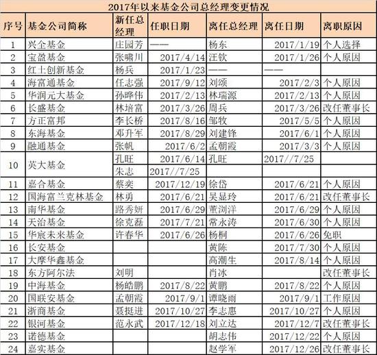 赵学军离任嘉实总经理,也使得今年总经理变更基金公司上升到24家。从年初的兴全总经理杨东离职,到年末的赵学军离任总经理转任董事长,两位总经理均是业内领军人物,杨东在任兴全基金总经理超过14年,打造了业内最具声誉的基金公司。赵学军则处于打造嘉实集团的角度升任董事长,继续在基金行业发挥影响力。