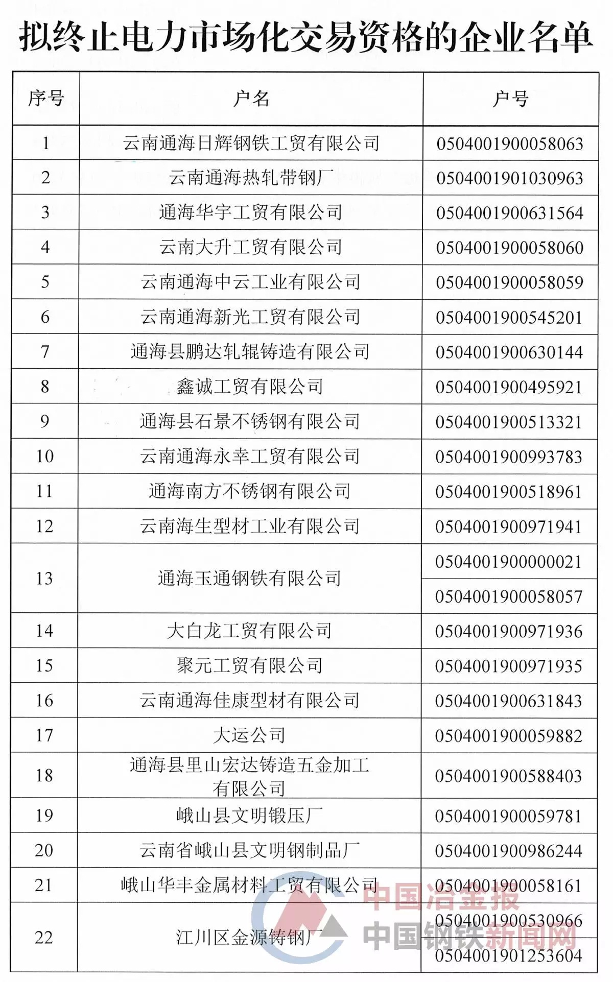 根据《公告》要求,经与供电单位沟通协调,涉及停电的企业将于6月起终止电力市场化交易资格。已完成升级转型、符合政策准入的钢铁企业,可凭相应文件与昆明电力交易中心联系交易资格维护事宜。